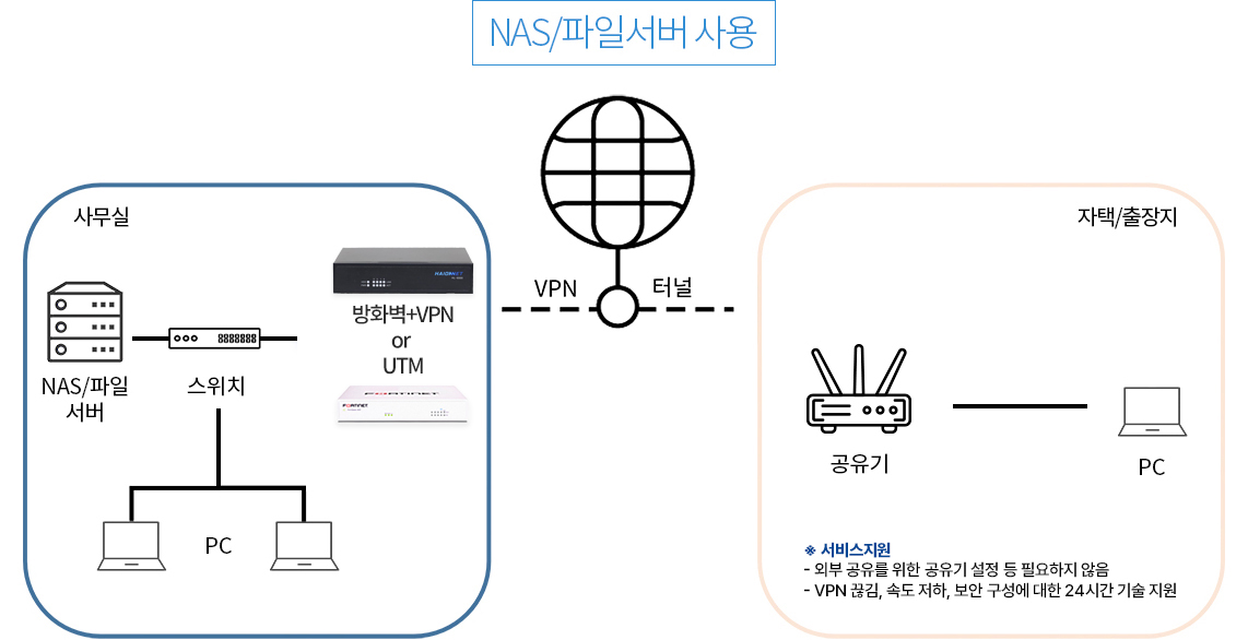 지사, 재택 및 출장지에서 안전한 네트워크 (파일) 공유가 가능합니다.